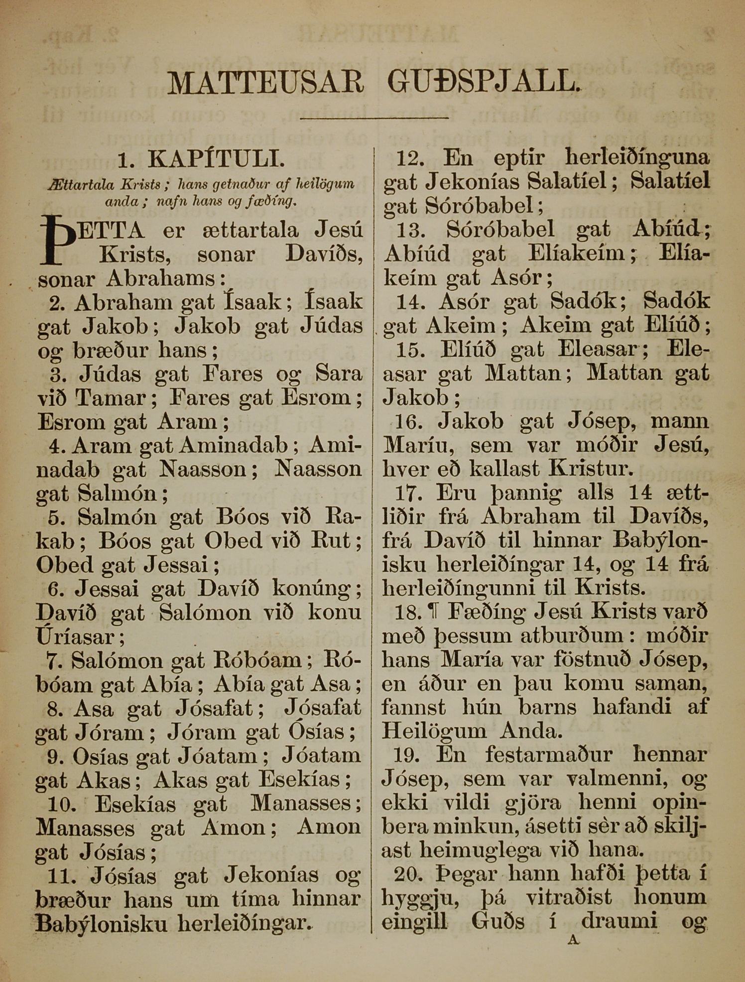 1863年冰岛语新约全书 马太福音 1 章 1 节到 1 章 20 节