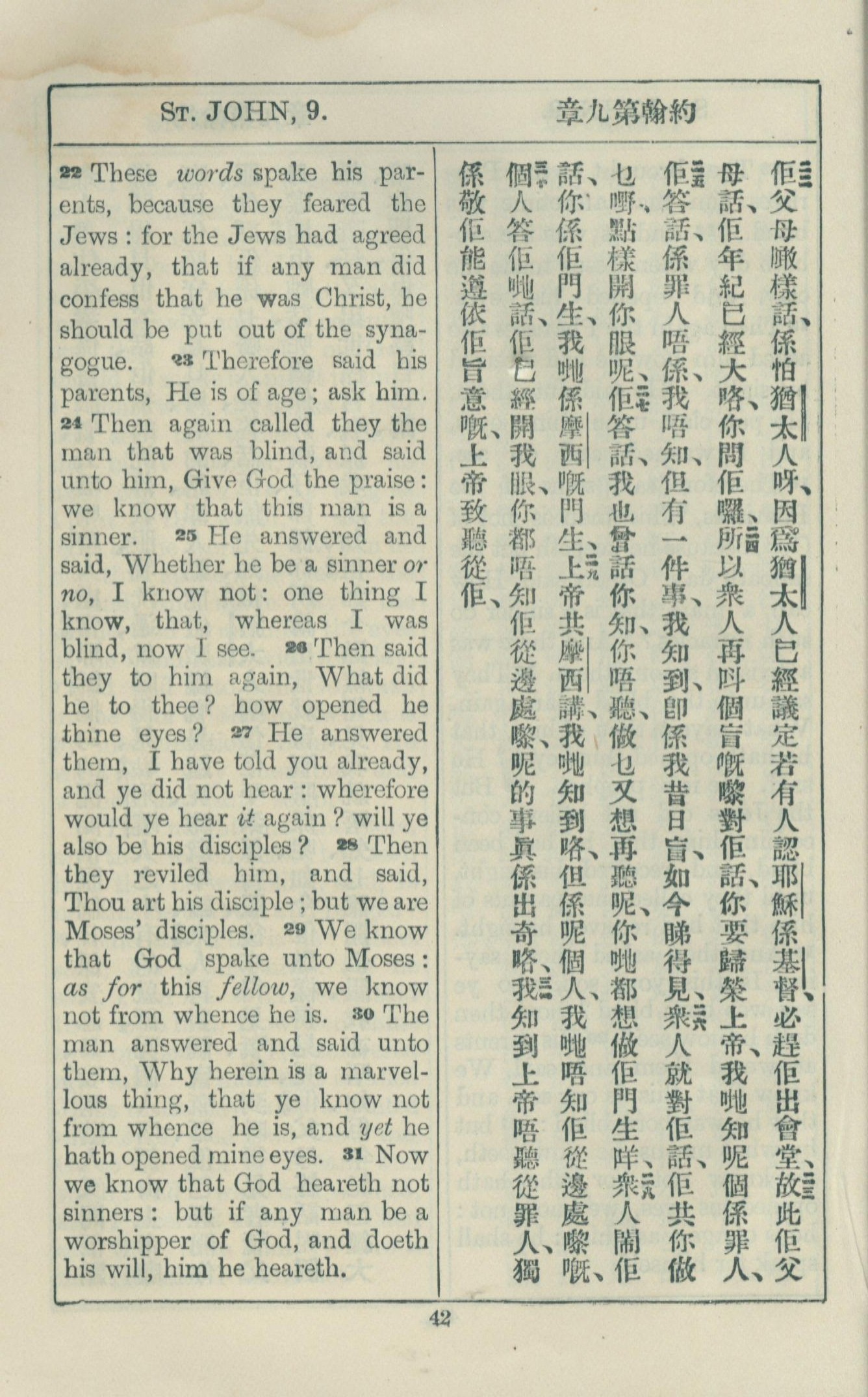 1925年約翰福音中西字 約翰福音 9 章 22 節到 9 章 31 節