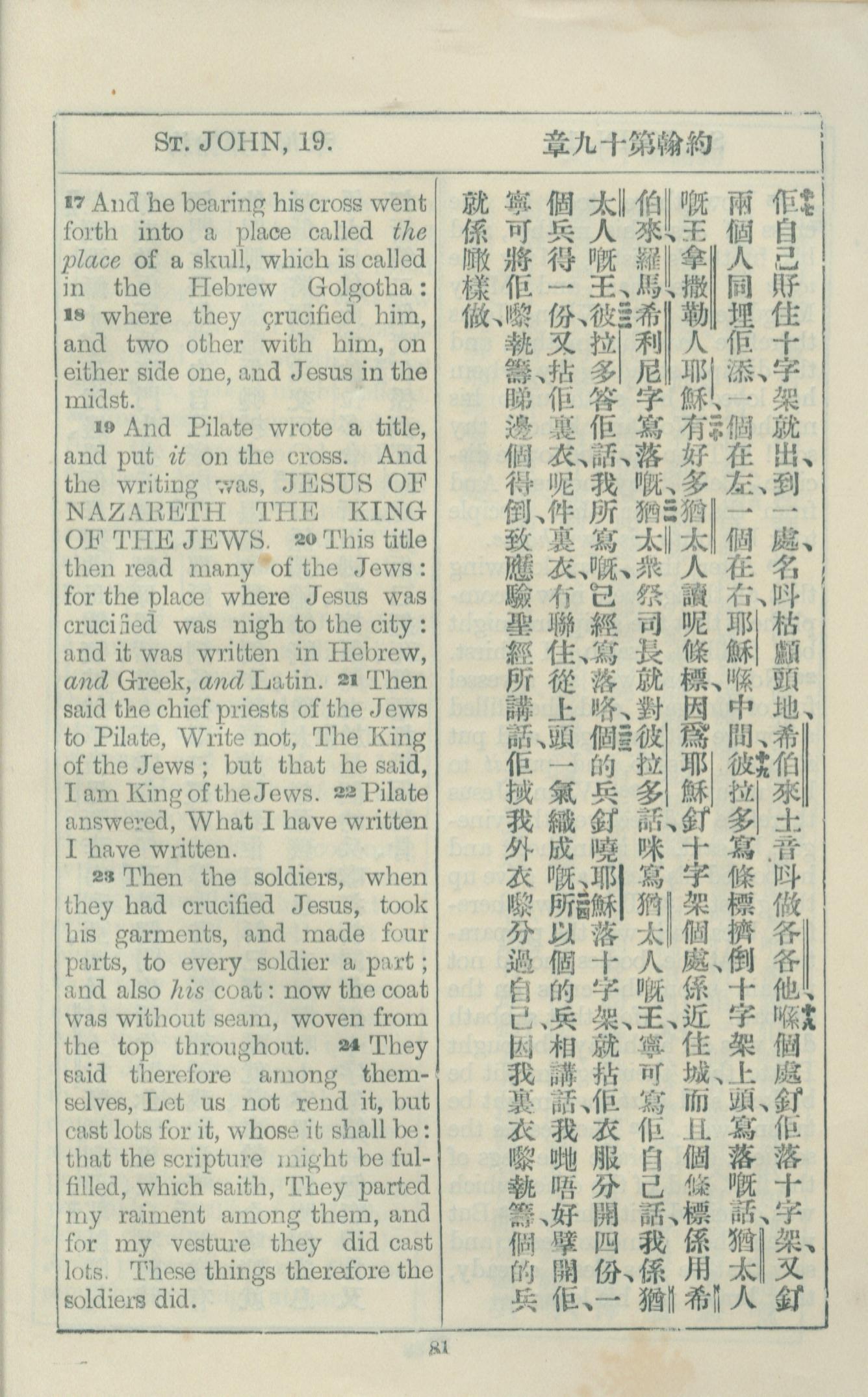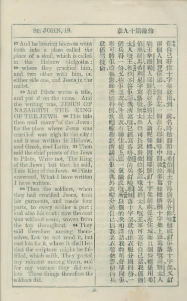 1925年約翰福音中西字 約翰福音 19 章 17 節到 19 章 24 節
