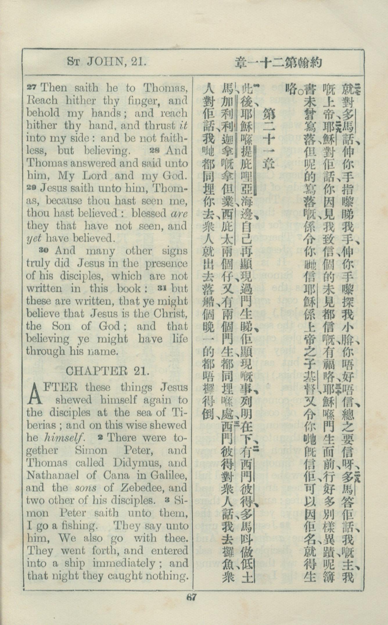 1925年約翰福音中西字 約翰福音 20 章 27 節到 21 章 3 節