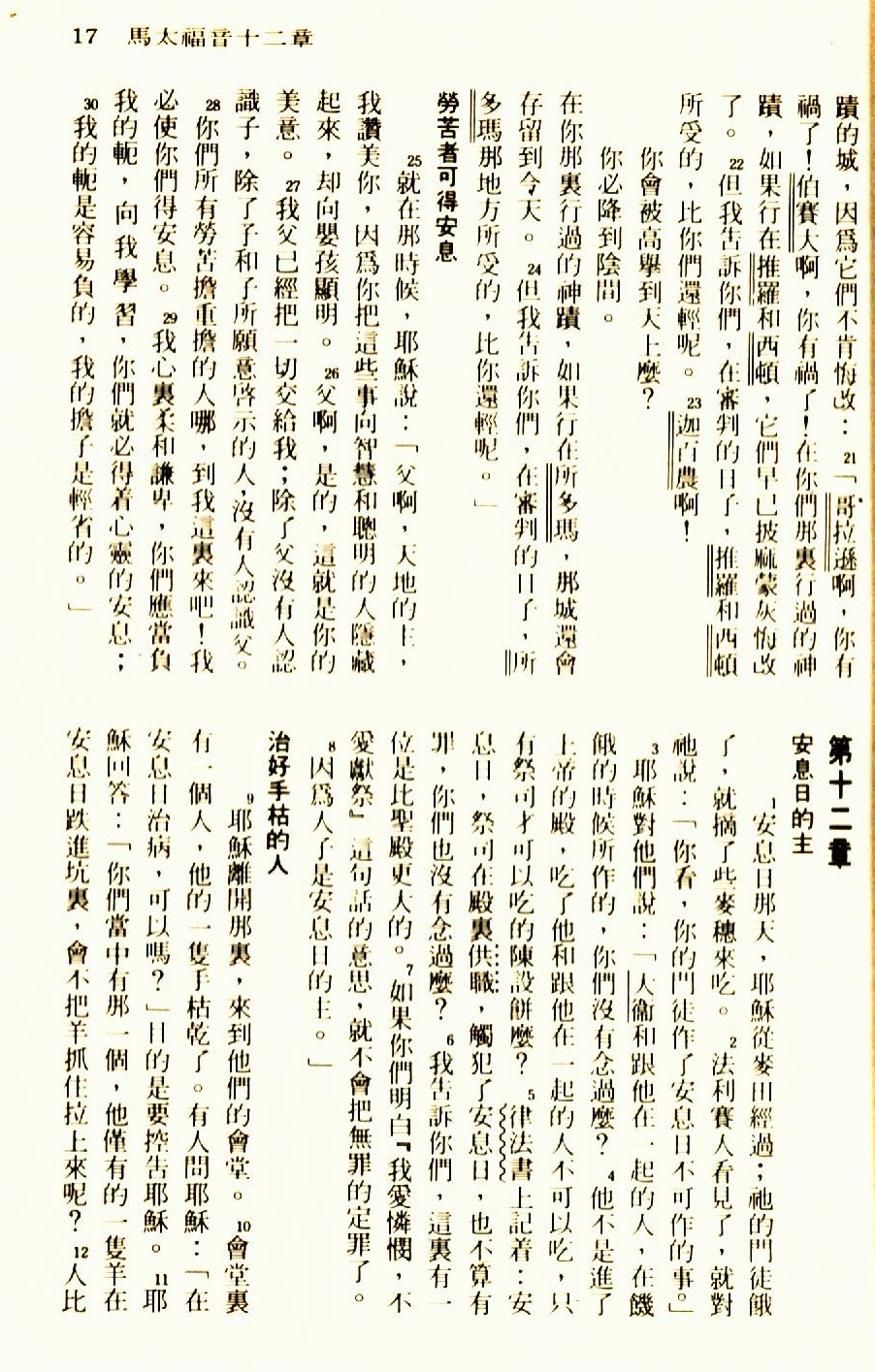 1976年聖經新譯本新約 馬太福音 11 章 21 節到 12 章 12 節