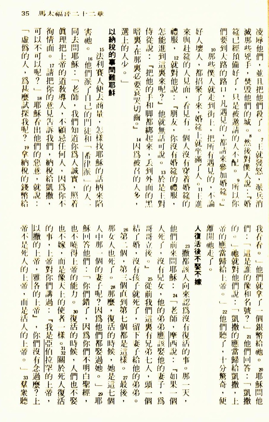 1976年聖經新譯本新約 馬太福音 22 章 7 節到 22 章 33 節