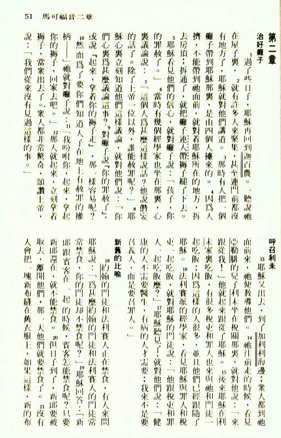 1976年聖經新譯本新約 馬可福音 2 章 1 節到 2 章 21 節