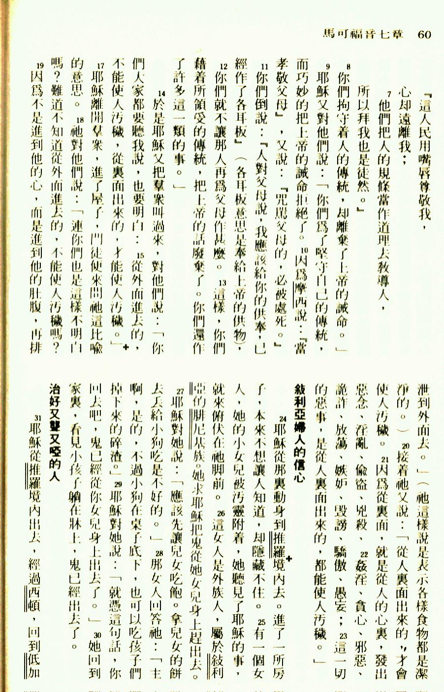 1976年聖經新譯本新約 馬可福音 7 章 7 節到 7 章 31 節